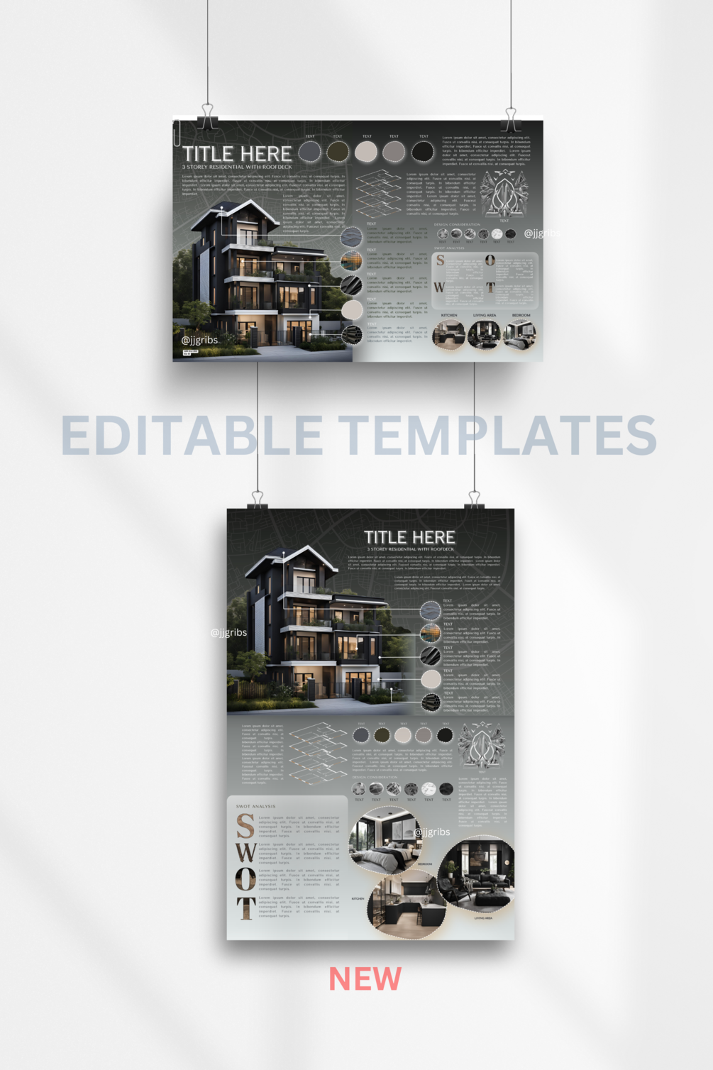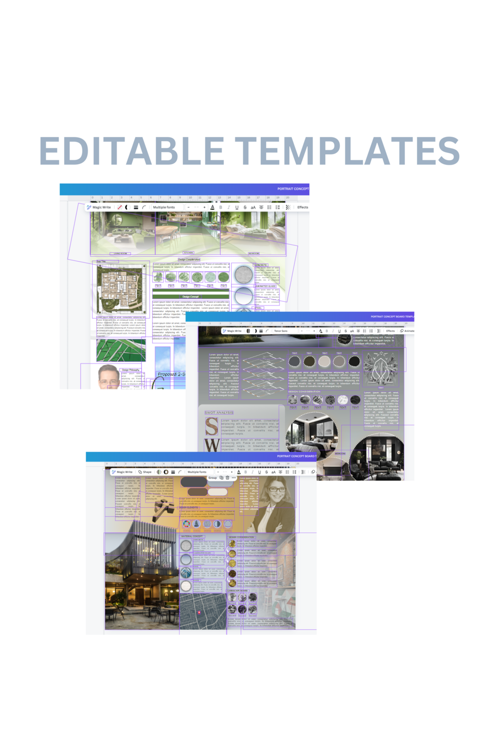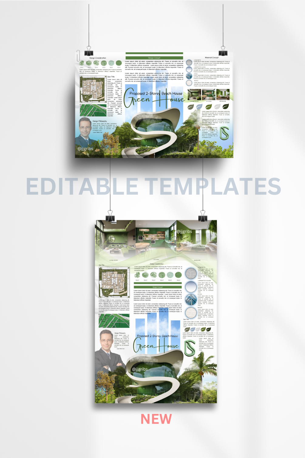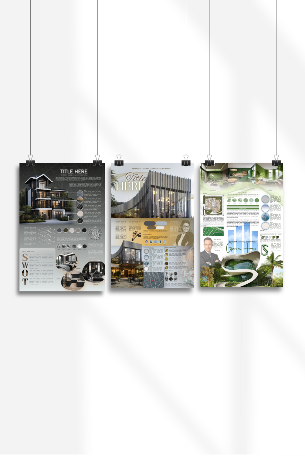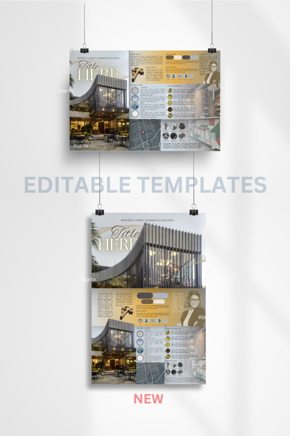 3 template sets of Architectural Concept Boards once you avail this product. This would probably help you how concept board works in Canva. It can be your practice guide to make your own creative and attractive presentation for your designs.