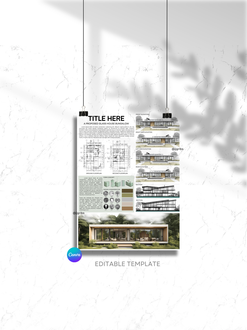 2 template sets of Architectural Concept Boards once you avail this product. This would probably help you how concept board works in Canva. It can be your practice guide to make your own creative and attractive presentation for your designs.